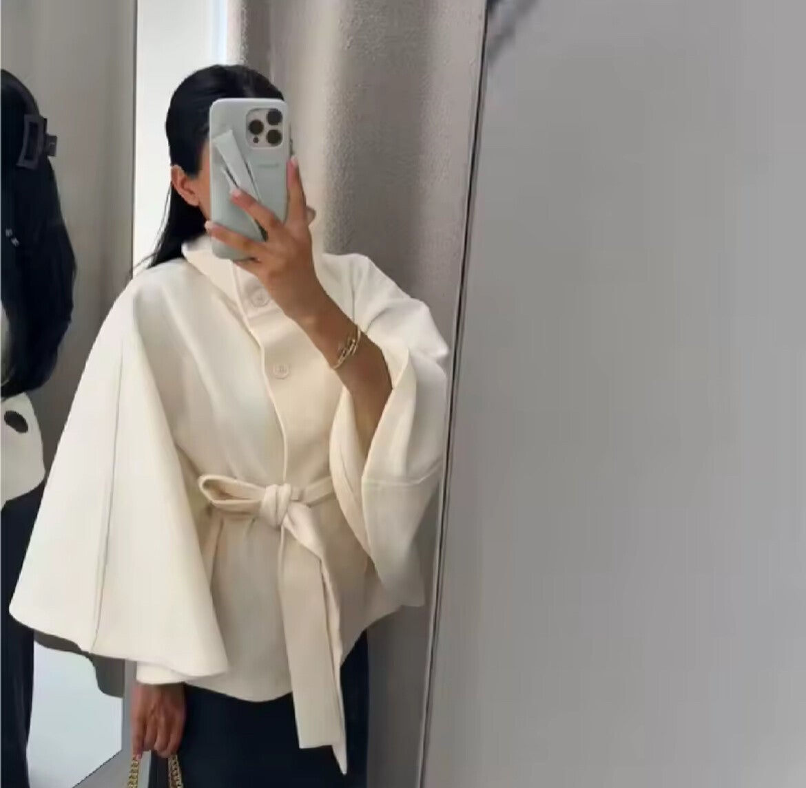 Mode frauen Lace Up Woolen Cape Mäntel Lose Stehkragen Batwing Hülse Taste Schwarz Grau Jacken 2025, Herbst Streetwear